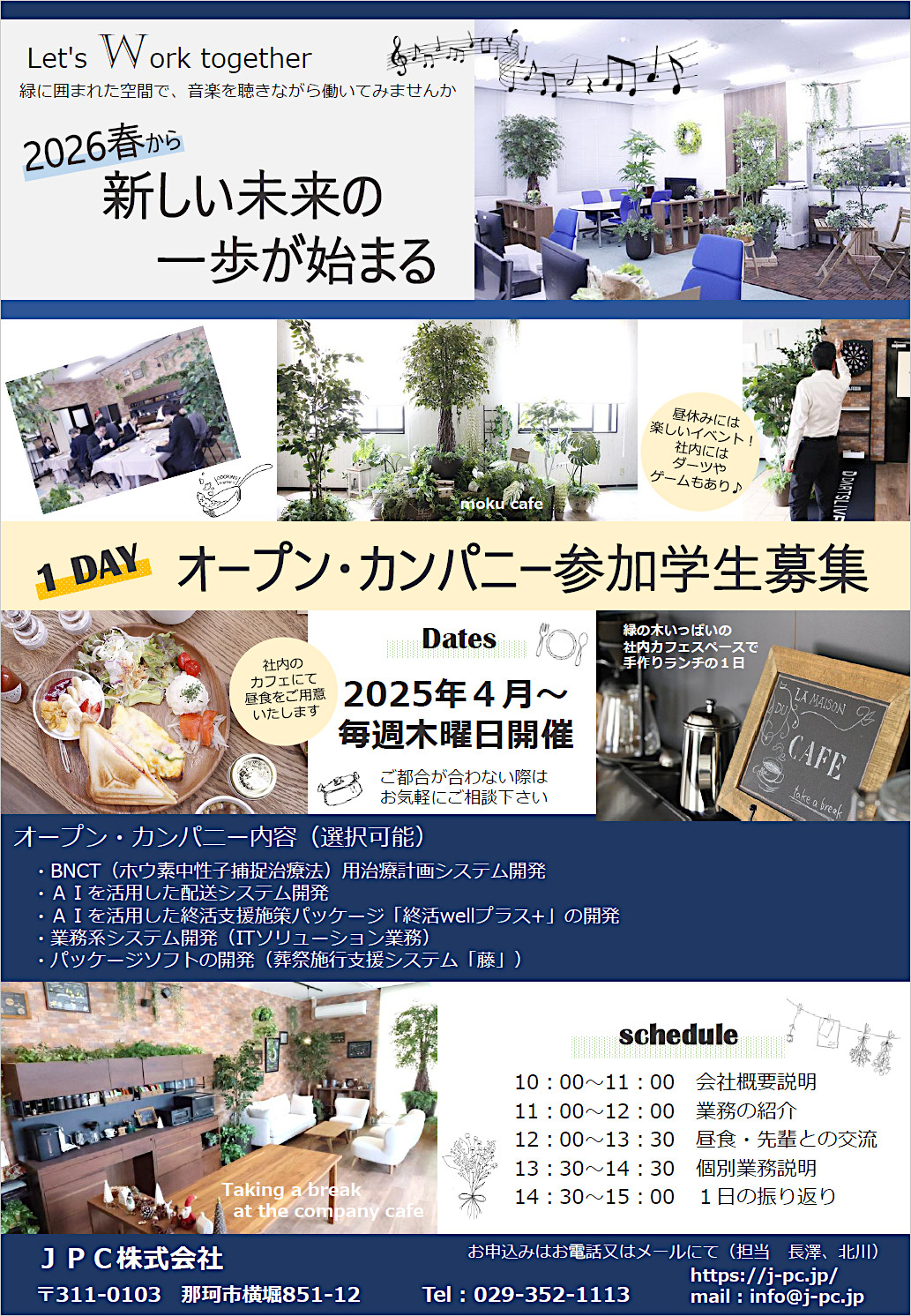 業務説明国の社会問題でもある孤独死は、核家族化が進む近年では、子どもたちは独立し親子別々で暮らすことが増え、高齢者世帯で夫婦のうちどちらかの死後、生活の中で誰とも関わらない「孤立」や「孤独」が原因とも言われています。茨城県の65歳以上の高齢者の割合は、30.8%と過去最高の数字が発表されています。特に県北地域は深刻で、大子町では50%以上が高齢者となっています。さらに世界の高齢者の割合では、世界トップの29.1%と2位のイタリアの24.5%を大きく上回っています。 このような状況から弊社では、2年前から茨城県を中心とした超高齢化社会問題を解決するために「終活wellプラス+」の開発に取り組み、地域の企業と共に「終活セミナー」を開催しています。参加者の多様な個人の生活・行動データをAIにて分析し、特性に合わせたイベントや教室に参加して頂くことで、新たなコミュニティを形成し、社会への参加を促進させ、孤独死問題を解決する仕組み作りや「終活」に対する不安指数の見える化を進めています。オープン・カンパニーから理解できること超高齢化社会で起こり得る問題を洗い出し、原因を分析し、対策を考えていただきます。対策後、「終活」の項目でもあるお金、保険、健康、手続き、遺言、相続、葬儀などの不安指数がどのように改善されたか見える化を図ります。自分のアイデア次第で、社会問題を解決し、地域に貢献できるので、「達成感」や「やりがい」を感じることができる業務です。